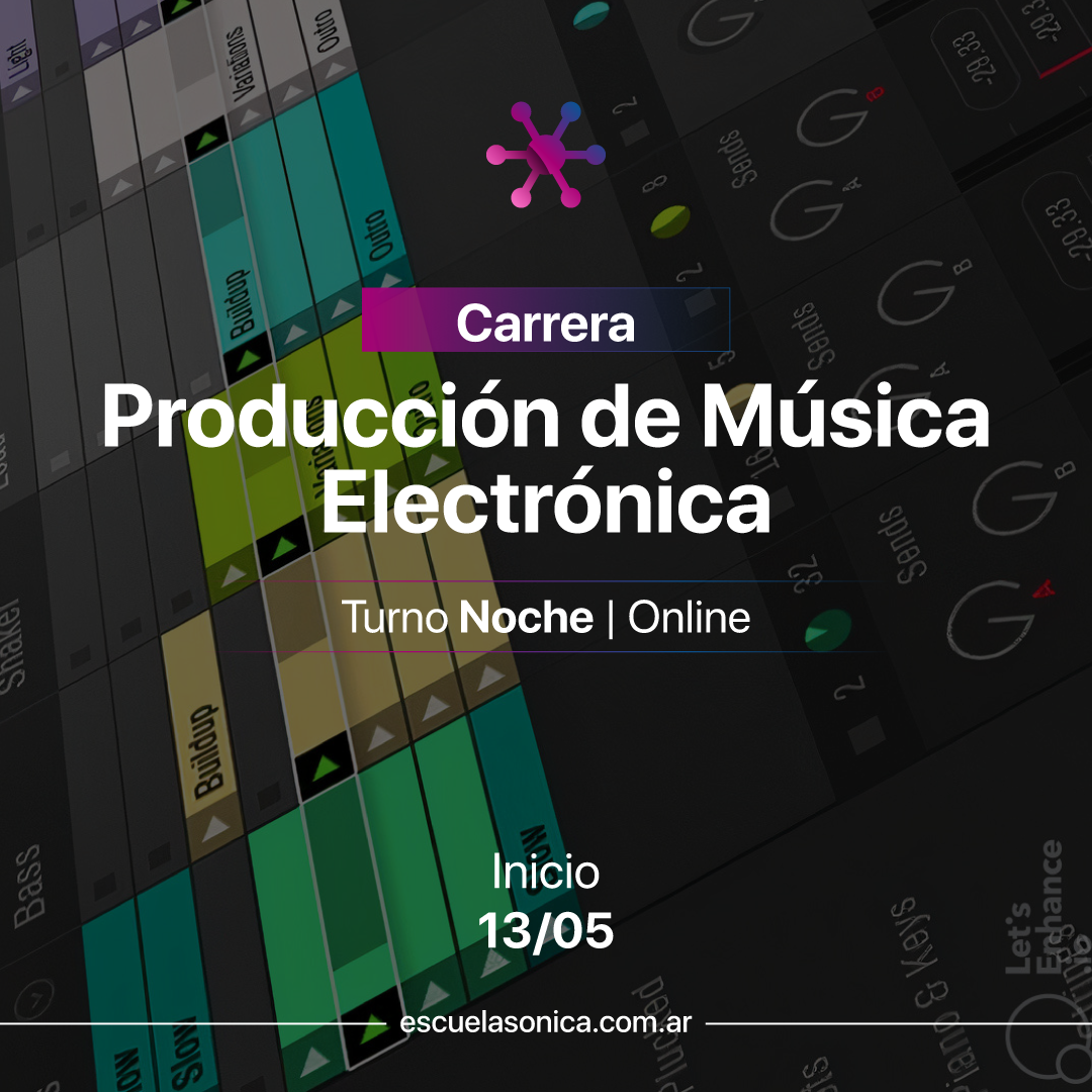 Objetivo: Vas a desarrollarte profesionalmente como productor, compositor e intérprete en vivo de música electrónica, diseñador sonoro y arreglador con aplicación directa, no solamente en el campo de la música, sino también en producciones multimediales como publicidad , videojuegos, cine, danza, teatro, performance interactiva, etc. Con el pago de la matrícula ya tenés reservado tu lugar.